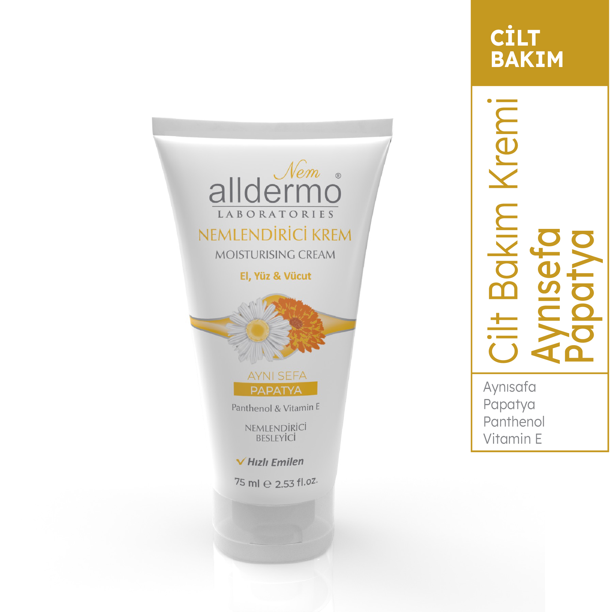 Alldermo el kremi içeriğindeki; Aynı sefa ve papatya ekstraktı, E vitamini ve Panthenol sayesinde elinizi nemlendirmeye, yumuşatmaya ve pürüzsüz görünmesine yardımcı olur. Elinize gün boyu bakım yapar ve papatyanın ferah kokusunu cildinizde bırakır.
